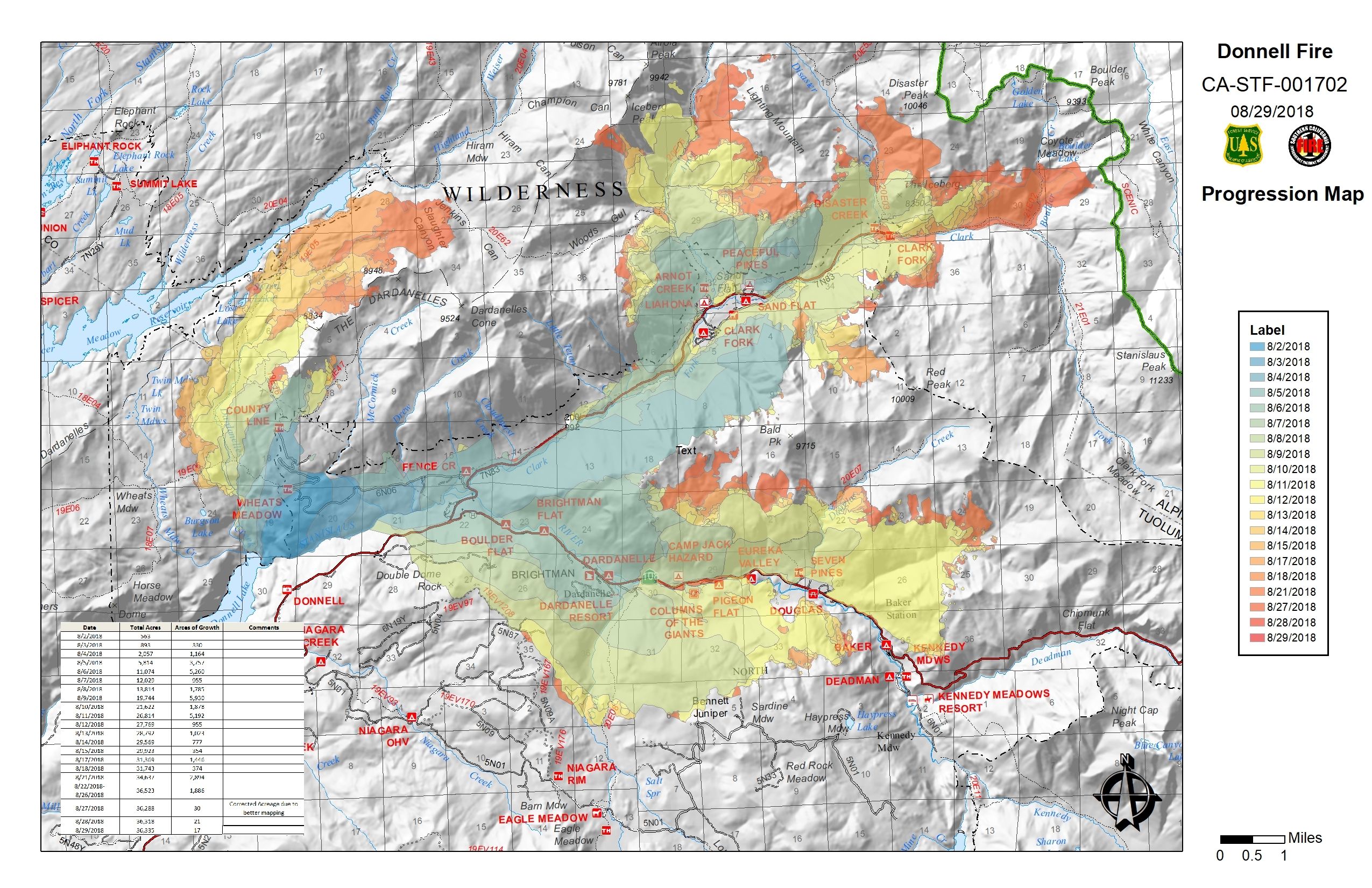 Aug 29: The Forest Service’s current strategy is being described as “hold, validate and mitigate.” Those battling the Donnell Fire will primarily focus on the northeastern edge today as the blaze continues to move along the Highlands, Arnot and Disaster creek drainages. Details here.