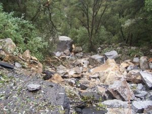 During summer, temperatures can be 90-100F causing many vehicles to overheat climbing the old grade. Locals tell stories of car accidents where the vehicles left the path of Old Priest Grade and tumbled into the ravine between the two roads, Grizzly Gulch. They claim that the terrain is so difficult that, in a few cases, the cars and bodies were not retrieved.