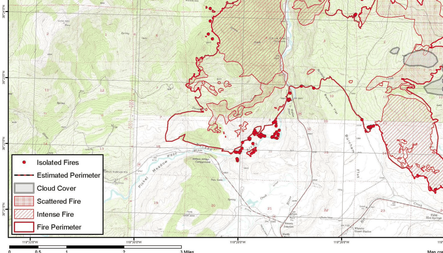 The number of evacuations and road closures increased yesterday as the fire burned to the west and south. Highway 108 Sonora Pass is closed between the intersection of Highway 395 and Kennedy Meadows. Areas evacuated include Leavitt Meadows Campground, Leavitt Meadows Pack Station, the Marine Corps Mountain Warfare Training Center, Devil’s Gate Pass, Swauger Creek and Fales Hot Springs.